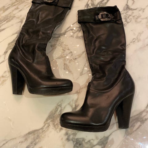 Calvin Klein saappaat, koko 38, musta väri. Saappaat ovat korkeakorkoiset ja sääriosa joustaa ja mahtuu moneen kokoon.