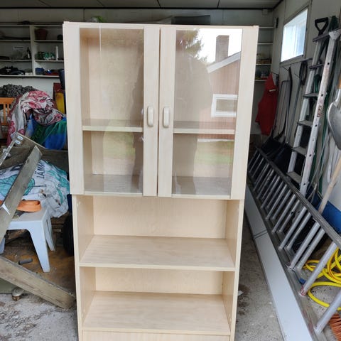 Vitriini on siistissä ja hyvässä kunnossa,oven lasissa tai lasihyllyissä.ole lohkeamia eikä rikkoja.Ainut vika minkä huomasin oli puuosassa pieni rikamajälki,siitä kommenteissa kuva.