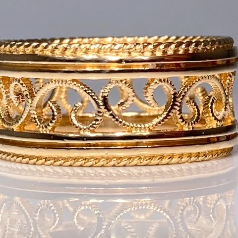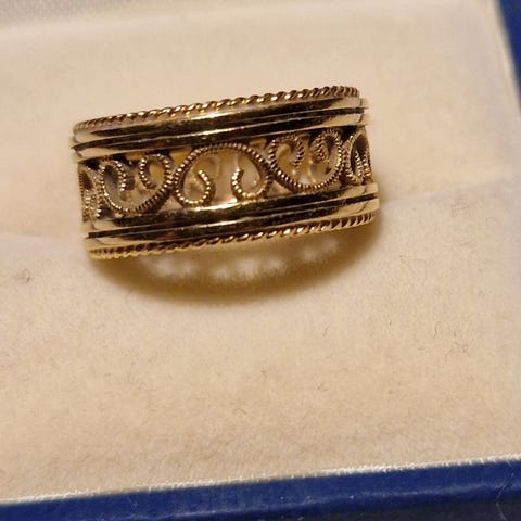 Myynnissä suhteellisen siisti Kalevala filigraani sormus. Valkokultaa 18k. Paino 6.4 g. Mukaan rasia.