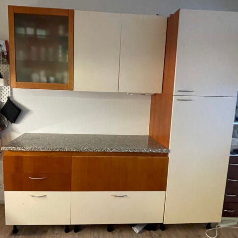Käyttökelpoinen, vaikka elämän jälkiä. Ostaja irrottaa ja kuljettaa kaapit. Hinta sisältää keittiön rungot, ovet, hyllyt ja vetimet. Nouto viimeistään 8.2.
