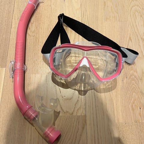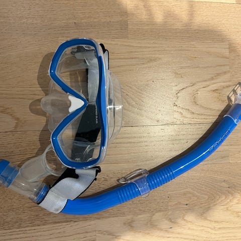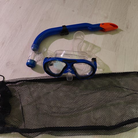 Uima- tai snorklausmaski, jossa kirkas linssi. Käyttämättä jääneet.