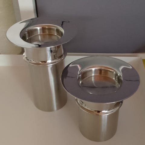 Jaloteräksestä valmistetut kynttilänjalat desing Tapio Wirkkala 2 kpl. Kynttilänjalkojen korkeus 18 cm. Niihin mahtuu 7 cm halkaisijaltaan oleva kynttilä. Yhteishinta 110 €.
