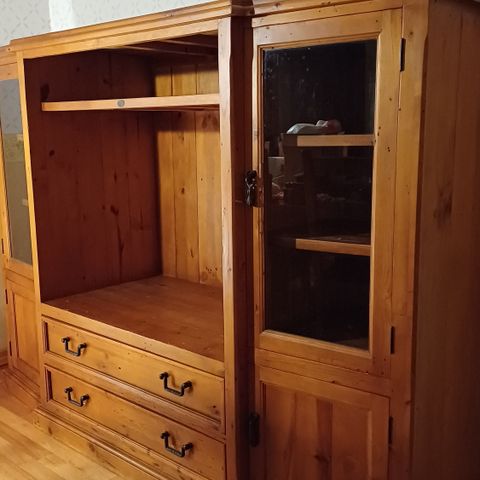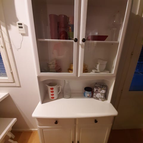 Vanha liukulasivitriini, entisöity kalkkimaalilla. Kapea ja matala, kaksi hyllyä ja laatikot. Täyspuuta. Nouto Haukiputaalta (Onkamo).