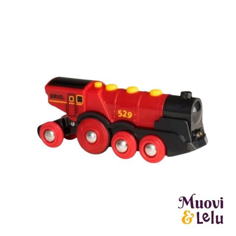 Brio My first paristoveturi, 33705. Paina ylimpänä olevaa nuolinappulaa ja veturi alkaa liikkua eteenpäin. Käytetty. Pieniä käytön jälkiä näkyy kuvissa. Magneettiliitos on hieman löysä (näkyy kuvassa), mutta ei vaikuta käyttöön. Muuten hyvässä kunnossa ja täysin toimiva, testattu ennen myyntiä. Ikäsuositus 18kk. Sopii täydellisesti muiden Brio-junien kanssa.