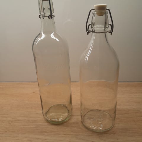 Erä lasipulloja lukitus- eli patenttikorkilla, värit ruskea ja vihreä.