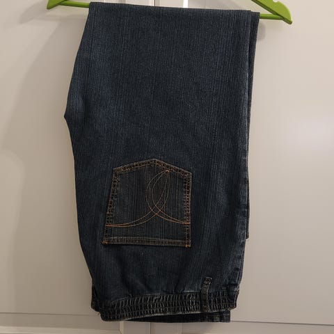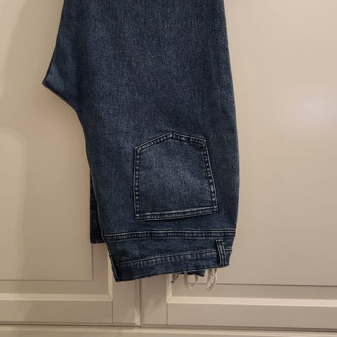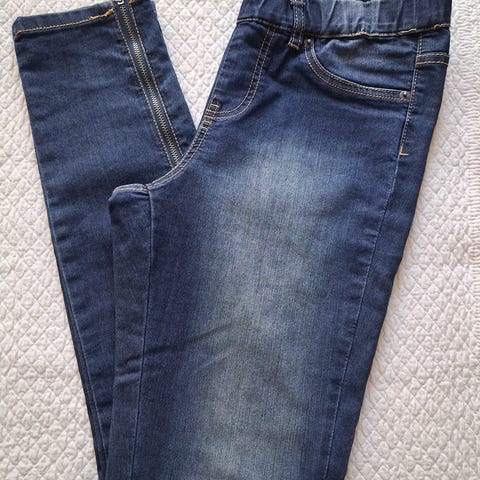Naisten valkoiset farkut, koko 44. Toisen etutaskun alla pieni tahra (näkyy viimeisessä kuvassa), en ole yrittänyt poistaa.