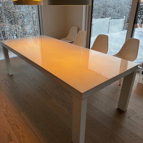 Pöytä jotain pinnoitettua kovaa levyä, helppo pitää puhtaana. Pinnassa jotain käytönjälkeä, mutta yleisilme siisti. Kestävä ja tukeva pöytä. Metallijalat.