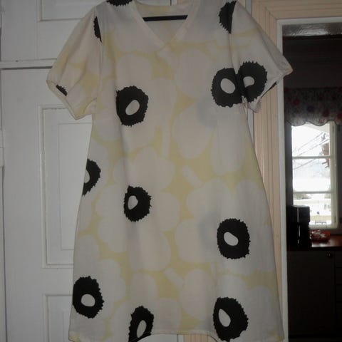 Käytetty puuvilla mekko. Hieman A-linjainen, sivusaumataskuilla. Ommeltu itse Marimekko kankaasta. Siisti ja värit ok.
