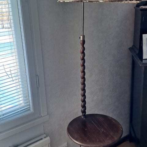 Kaunis, vanha ja täysin kunnostettu jalkalamppu uuteen kotiin. Sähköt uusittu, lamppukuvun kangas puhdas ja siisti (luonnonvalkoista paksumpaa puuvillaa). Korkeus 157 cm, kuvun läpimitta 38 cm. Nouto Kähäristä.