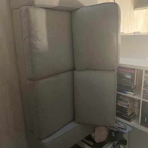 sohva harmaalla kankaalla. Kolmipaikkainen sohva, jossa irrotettavat selkätyynyt. Suunniteltu tarjoamaan istumismukavuutta ja käytännöllisyyttä.