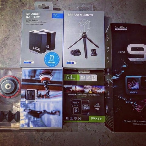 (GoPro Hero 10 Black ovh. 299€, Sport Kit pakkaus ovh. 59,95€ ja Suojakotelo ovh. 54,95€)