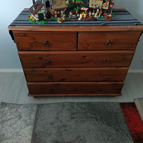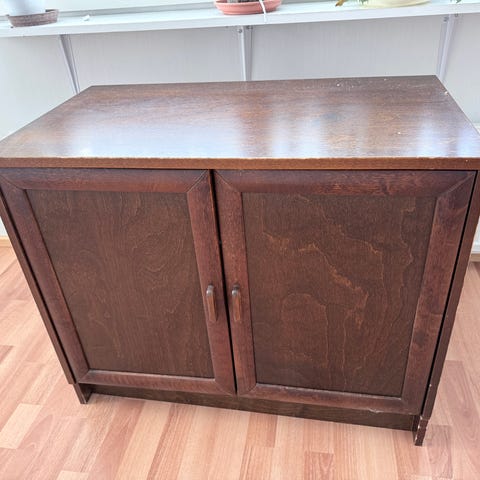 Hyväkuntoinen valkeaksi maalattu puinen lipasto.
