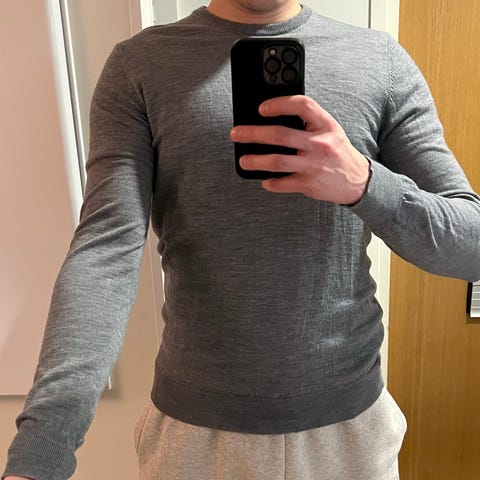 Suitsupplyn harmaameleerattu pellavasekoite pusero/neule. Hyvässä kunnossa. Kokomerkintä L. Käsille on slim fit, mutta keskivartalolle on aavistuksen enemmän tilaa. Kuvan malli 183 cm.