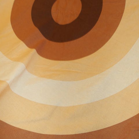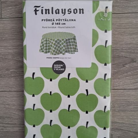 Finlayson Marjatta Metsovaara pyöreä pöytäliina, 100% puuvillaa. Matossa on monivärinen kuviointi, jossa korostuvat punainen, vihreä ja sininen väri.