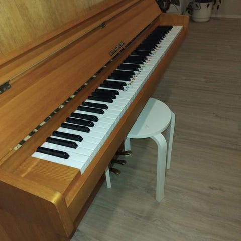 Annetaan vanha piano, jota ei ole viritetty vuosiin. Pianossa äänenvaimennuskytkin.