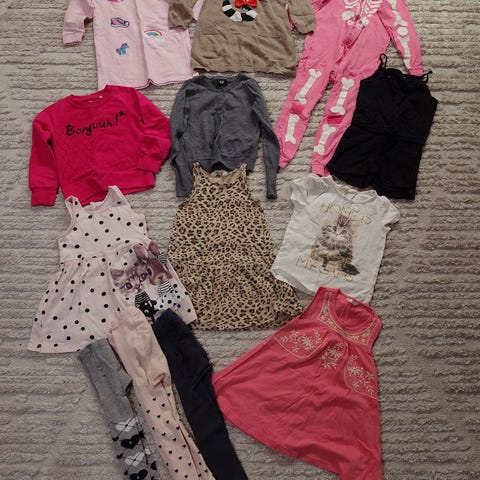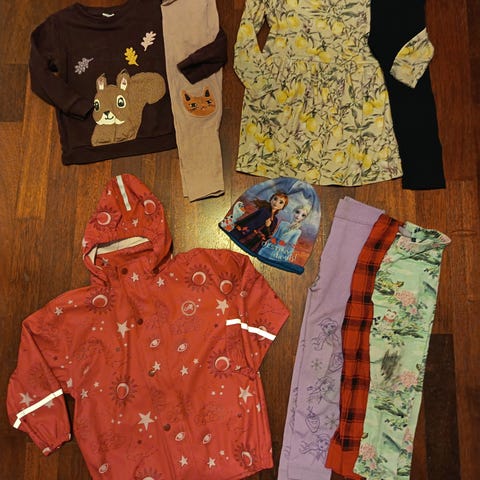 Vaatepaketti koko 98-104. 1x collegepaita, 3x pitkähihainen paita, 2x leggingsit, 1x collegehousut, 1x collegetakki. Merkkeinä Muumi, Lindex, Name it, Gugguu. Yhdellä käytettyjä collegetakkia lukuunottamatta, siisti käytetty kunto. Rakettipaidasta korjattu hihasta pieni reikä, Haisulihousuista printti hieman haalistunut, Gugguun collegetakissa väri uudesta haalistunut. Hajusteeton pesuaine + mieto pyykkietikka, ei eläimiä tai tupakointia.