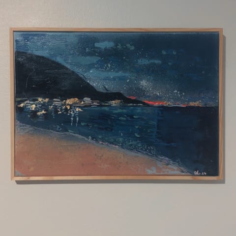 Myytävänä iltainen merimaisema akryylimaalaus. Koko 60cm korkea ja 80cm leveä. Riipustus valmiina.
