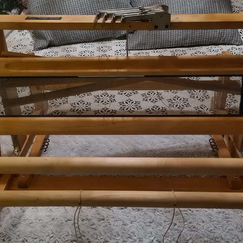 Käsityönä valmistettu seinävaate, jossa on kukkakuvio. Värit ovat vaaleanvihreä, ruskea, roosa ja valkoinen. Materiaali on kudottu kangas, jossa on hapsut alareunassa.