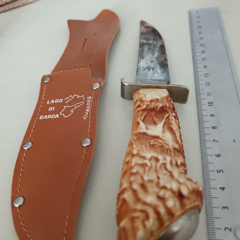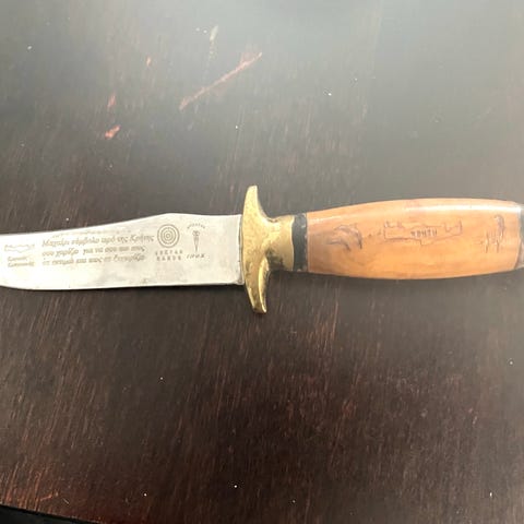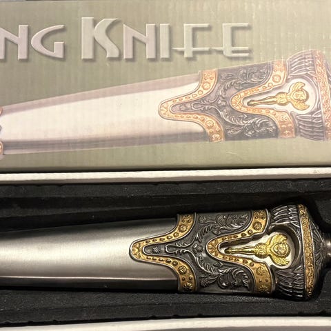 Myydään näyttävä ja erikoisella muotoilulla varustettu Egyptian Knife -tyylinen veitsi.