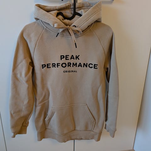 Peak Performance huppari vaaleanpunaisena, koko XS mutta menee S koolle. Pieni värinlähtö toisessa taskussa, ei juurikaan huomaa ja muuten kunnoltaan erinomainen