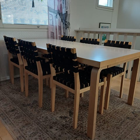 Artek 82A ruokapöytä ja 6 kpl Artek 69 tuoleja.