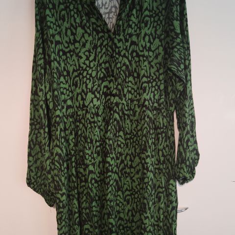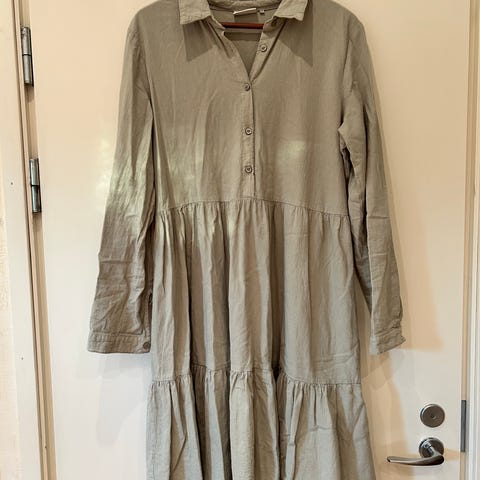 Kaffen ruskea viskoosimekko, koko 40. Hihansuissa ja rinnuksessa kuminauhaa, joten joustaa tarvittaessa. Mekossa on taskut.