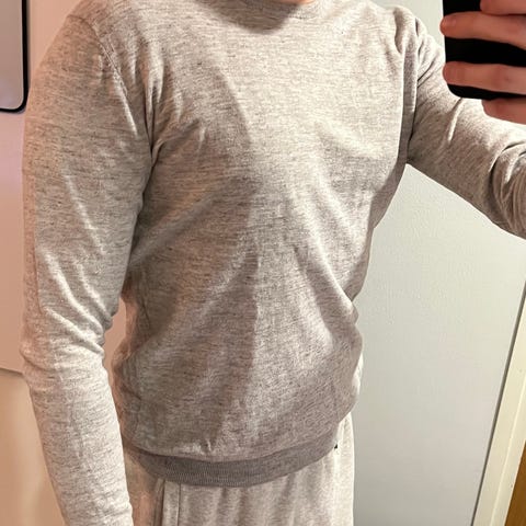 Suitsupply harmaa ohut merinovillainen paita. Hyvässä kunnossa. Kokomerkintä L, istuu slimmisti ja enemmän kuin M-koko, mutta pituutta kuitenkin hyvin helmassa ja hihoissa. Kuvan malli 183 cm.