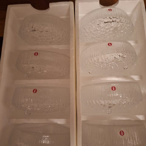 Myydään uudet, ei kertaakaan käyttöön eksyneet Iittalan Ultima Thule sarjan kulhot 115mm 4kpl ja kynttilälyhdyt 65mm 2kpl.