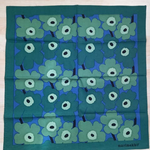 Marimekon vaaleanpunainen unikkokuviollinen huivi. Huivin päässä hapsut. Kangas ohutta materiaalia. Ei lappuja, ja pieni jälki siinä kohdassa missä lappu on ollut.