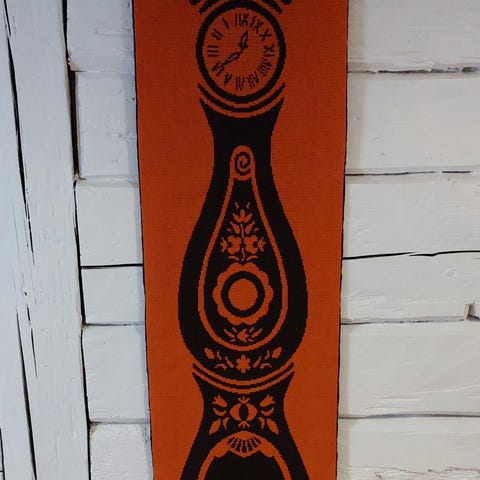 Käsityönä tehty pieni ryijy kauniilla väreillä.