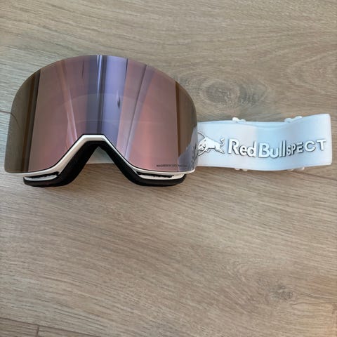 Valkoiset Red Bull SPECT laskettelulasit sinisellä peililinssillä.