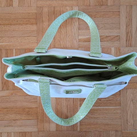Kaunis vetoketjullinen beige olkalaukku säädettävällä olkahihnalla, kultaiset metalliosat. Tekstiilivuori, ja kolme sisätaskua, yhdessä vetoketju. Mukana myös avaimenperä. Koko 18x23cm.