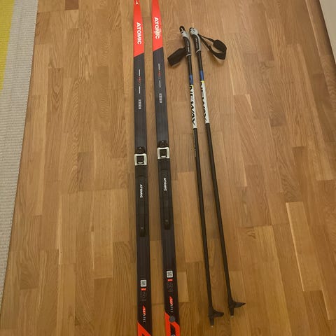 Hyväkuntoiset ja helppohoitoiset 138cm atomicin karvapohjasukset sauvojen kera eteenpäin, lapset kasvoivat meillä näistä ulos.