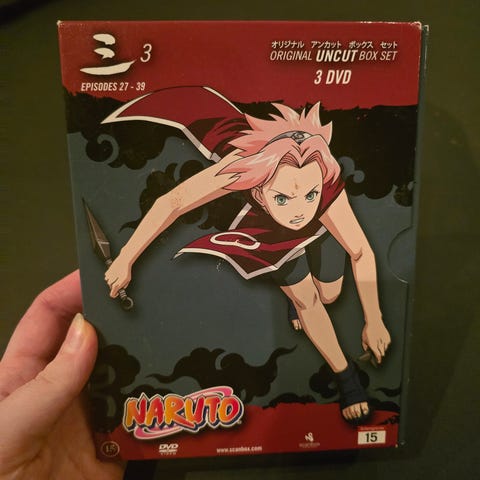 Naruto anime osa 2, jaksot 14-26 suomi teksteillä. Pahvisessa kannessa pientä kulumaa, muuten hyväkuntoinen.