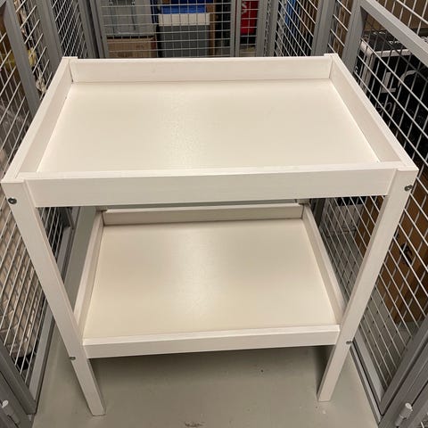 IKEA Sniglar hoitopöytä, jossa puurunko ja valkoinen taso. Hoitopöydässä kaksi tasoa, joista ylempi reunuksilla varustettu. Sopii lasten vaipanvaihtoon ja hoitotilanteisiin.