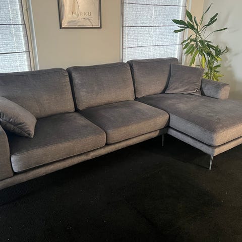 Myynnissä Belluksen valmista Trendline avokulmasohva. Belluksen sohvat tunnetaan erittäin vahvoista puu / vaneri rungoistaan. Sohvan runko on paksua puuta / vaneria. Ei siis murenevaa lastu / huonekalulevyä. Kankaan väri harmaa. Erittäin kirkkaassa valossa aavistuksen rusehtavan harmaaseen taittava. Sohvan istuin ja selkätyynyjen päälliset ovat irrotettavissa pesuun. Sohvassa avokulman puolisuus kuvien mukainen. Ei vaihdettavissa. Sohvassa ei ole vuodeominaisuutta. Trendline sohvat myydään normaalisti noin 20cm korkeilla jaloilla. Tähän sohvaan on tehtaalta lähtiessään valittu 11cm korkeat jalat. Tästä johtuen sohvan istuinkorkeus on melko matala. Tämä on hyvä valinta lyhyelle istujalle ja lapsiperheille. Yli 175cm pitkälle asiakkaalle reisituki saattaa olla riittämätön. Sohvaan vaihdetaan meidän toimesta 20cm korkeat mustat kalustejalat aivan lähipäivinä jos ei mene näillä jaloilla nopeasti kaupaksi. Tämän jälkeen hinta nousee luonnollisesti hieman. Huomioitavaa sohvan kunnossa: Osa selkätyynyistä aavistuksen menettäneet ryhdikkyyttään. Tämä huomioitu hinnassa. Sohvan hinta: 659e.