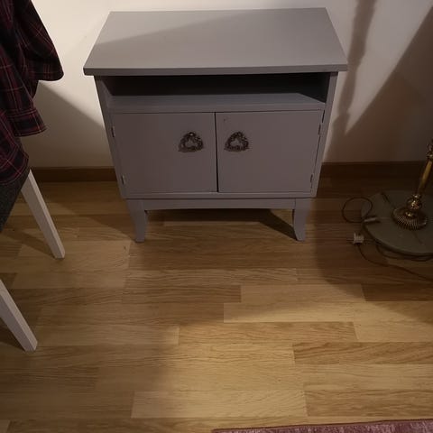 Valkoinen/puunvärinen lipasto. Laatikot hyvässä kunnossa. Kannessa jonkun verran naarmua, niinkuin kuvasta näkee. Omat kantajat mukaan. Auton saa oven eteen parkkiin, maan tasossa sijaitsee.