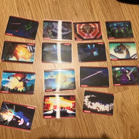 8 kpl leimattuja Evangelion -postimerkkejä Japanista. Yhdestä merkistä repeytynyt kulmaosa irti, kolmessa muussa taittoa ja repeämää. Loput neljä ehjiä ja paremmassa kunnossa kuvapuolelta. Virallinen Nipponin julkaisema Evangelion-postimerkkisarja.