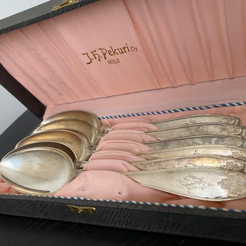 Myydään kaunis ja alkuperäinen Juho Hesekiel Pekurin valmistama hopealusikkasarja. 12 kpl pieniä hopealusikoita. Pesä on kullattu (vermeil). 1900-luvun alkupuoli. Tyylikäs malli ja hyvä antiikkikunto. Normaalia ikäpatinaa, ei vääntymiä. Myydään settinä ei erikseen.