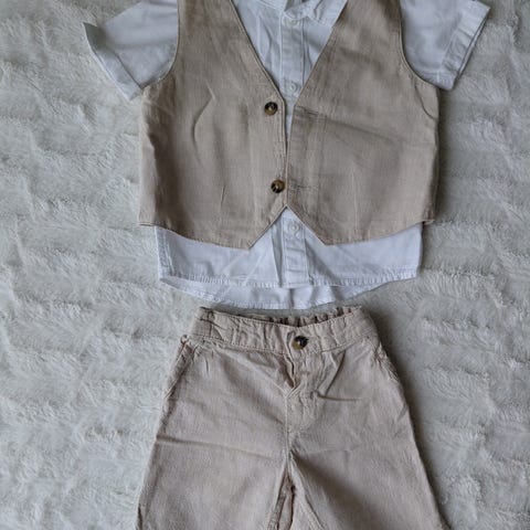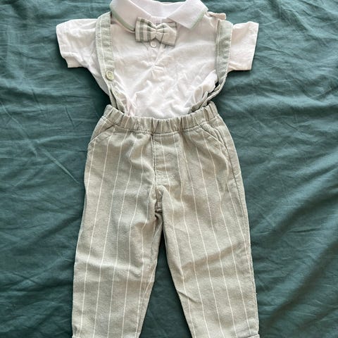 Kesäinen, pellava-puuvillasekoitetta oleva juhla-asu vauvalle, koko 74. Beiget shortsit säädettävällä kuminauhavyötäröllä ja irrotettavilla, säädettävillä henkseleillä. Sinivalkoraidallinen, lyhythihainen kauluspaita. Uudenveroisessa kunnossa.