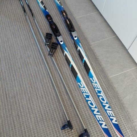 Fischer -monot koko 38, Essential Arctix -sukset 140 cm ja Rex Apollo -sauvat 105 cm.