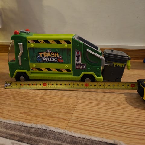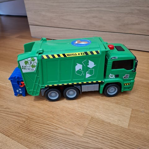 Toimiva ja ehjä roska-auto äänillä ja ylös pumpattavalla roskakontilla. Mukaan tulee neljä muovista roskista. Monet leikit kestänyt ja naarmuja löytyy, mutta ehjä ja toimiva vielä seuraaviin leikkeihin.