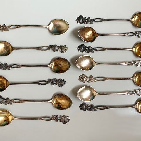 Kolme koristeellista alpakka-kahvilusikkaa joiden kahvoissa on ruusu