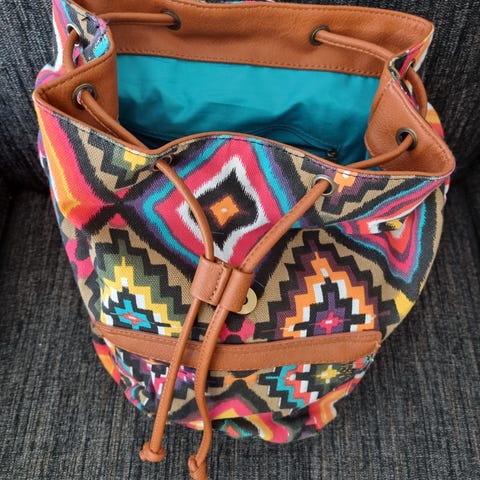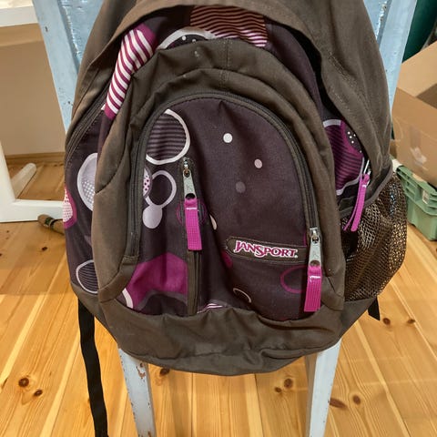 Sininen ja monilokeroinen, tilava mutta kevyt reppu. Todella kätevä ja ihanat pehmustetut hihnat.
