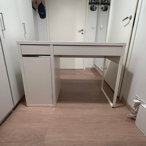 Ikeasta ostettu koulu-/työpöytä ja tuoli, jotka myydään settinä. Tuoli on alunperin pinkki, mutta se on maalattu valkoiseksi ja sekin on Ikeasta. Pöytä on muuten hyvässä kunnossa, mutta ylimmässä hyllyssä on hieman likapinttymää. Pöydässä on runsaasti säilytystilaa ja magneettiseinä.