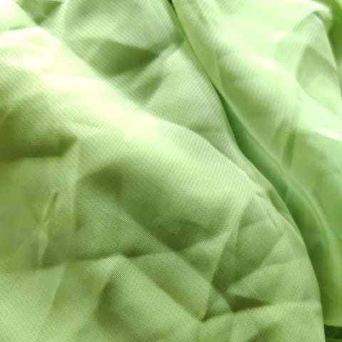Vaaleanvihreä sifonki jännällä prässätyllä tekstuurilla. Todennäköisesti polyesteria. Hento, murrettu vihreä. Katso kuvasta läpikuultavuus.