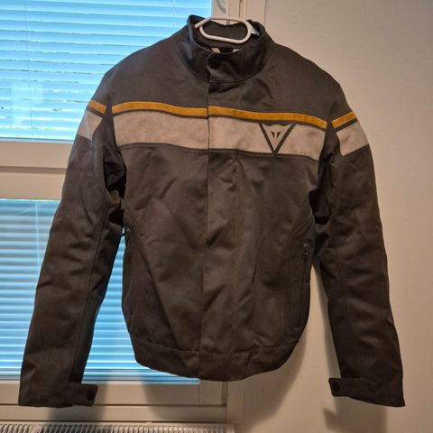 Dainesen ajovarustesetti. Takkiin löytyy kerrasto, housuihin ei. Takki kokoa 56, housut 52, kengät 44 ja hanskat M