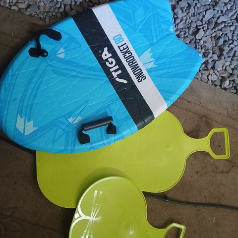 Liukureita pulkkia ja pari potkulautaa. Koitin kuvata viat, eli kaikissa naarmua ja halkeamaa.