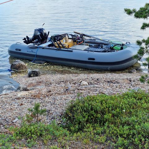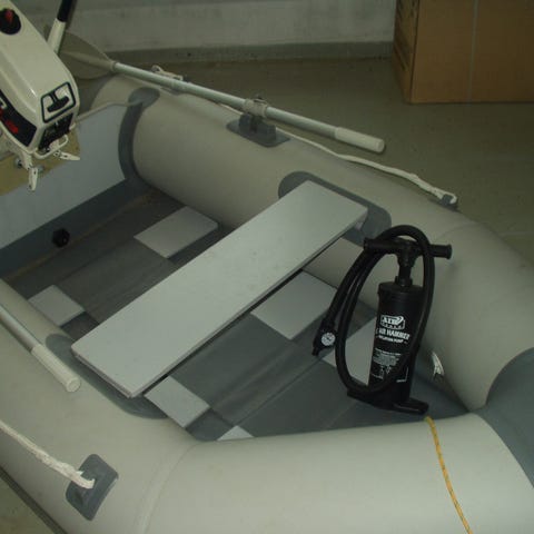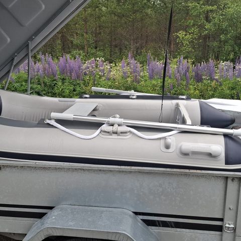 Mukana tulee airot, jotka saa kiinnitettyä veneen sivuille airojen pidikkeisiin ja jalkapumppu. Veneen reunoilla on turvanaru. Paketissa myös mukana kourjauspaikka.