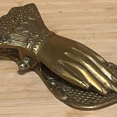 Antiikkinen messinkinen kirjeiden pidikejakso ; 20-luvun puoliväli.Erittäin hyvässä kunnossa.Mitat: 13 x 16 x 15 cmPaino noin 960 grammaa.